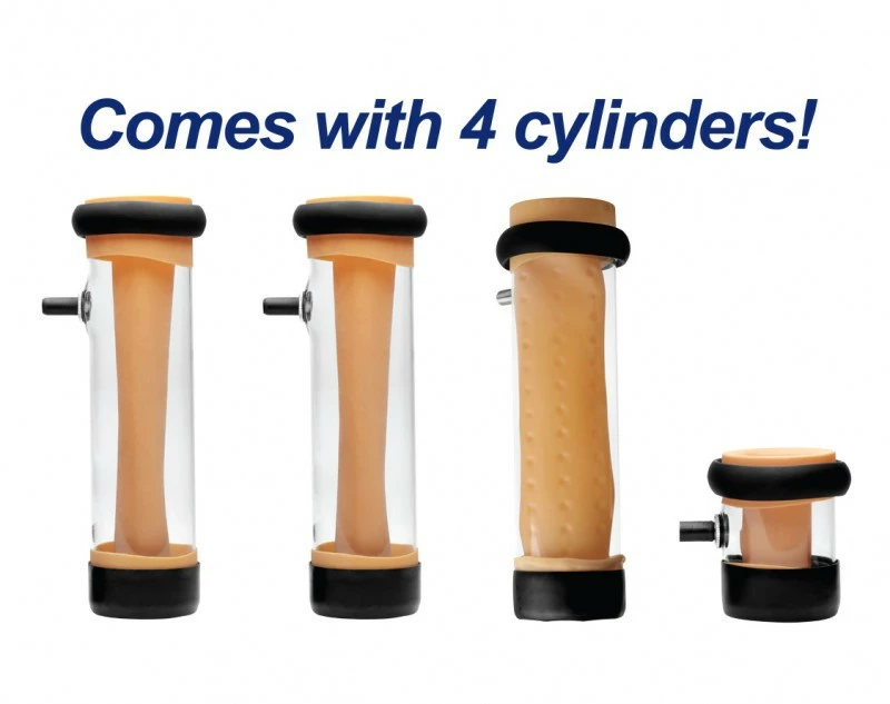 An update on one of our most popular male fucking machines, the Super Milker Deluxe Stroker Machine includes two more cylinders to suck your shaft! This powerful milking machine will actually stroke and suck on your shaft, with a grand total of 4 cylinders that deliver a range of stimulations. Everything you need for a revolutionary masturbation or partner experience is conveniently and discreetly housed within the locking top compartment of the machine. Plug in the hose, or two if you are sharing the machine or looking for more sensation, and use the dial controller to adjust the speed of the suction. Three unique cylinders are now included: a small one that will target your cock head for ecstasy, but can also be used on a clit or nipples; a fully-sized cylinder that is lined with nubs to massage your entire shaft with suction; and finally, two large, smooth cylinders for the classic milking experience. Just open up the case and surround your dick with contracting pressure to find out what this incredible machine is capable of!