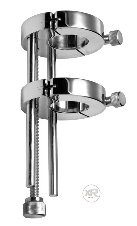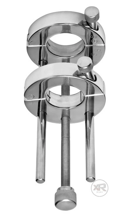 Then you start turning the screws; the first set of screws are for the rings to secure them around the scrotum. The next set screw (the large screw) begins to separate the two rings apart, and thereby stretching the scrotum. This stretch, combined with the built-in weight of the device will give your partner immense testicle pressure. See how far you can go, see how far you can stretch.