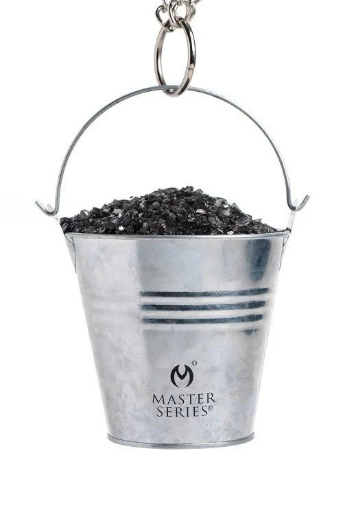 Treat your CBT slave to a unique torment! This ball-stretcher combines a Master Series bucket with a scrotal parachute, which wraps around their balls and dangles 3 chains and an O-ring. This devious duo sets you up for some creatively evil scenes: each time your plaything moves, drop another stone in; each time they moan, pour a little more water in; each time they answer a question incorrectly, add a little sand. Your only limit is your own imagination! You can also remove the bucket to connect the O-ring to a leash, ankle cuffs, or other BDSM devices.