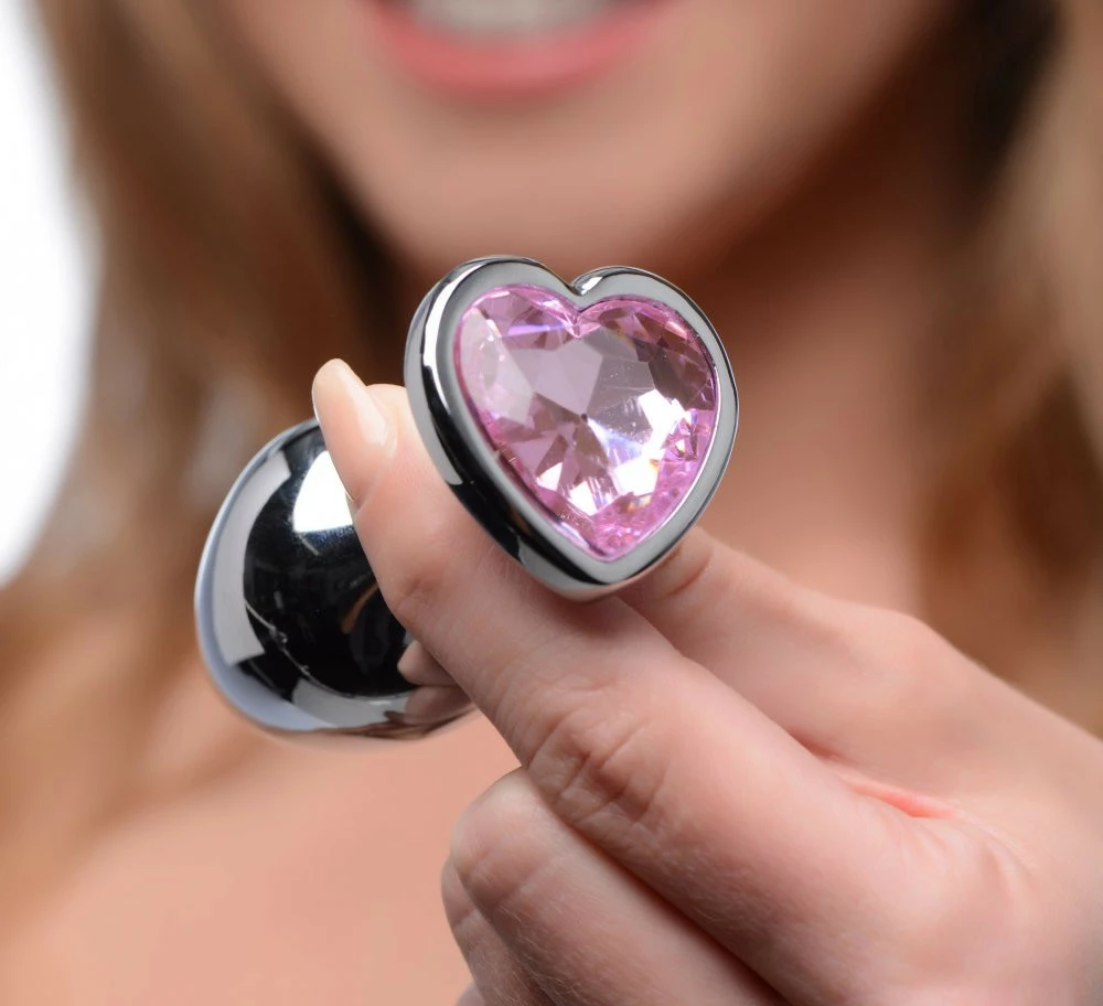 Is love in the air, or is love in your derriere? This lovely trio of smooth metal butt plugs is adorned at each base with a pink heart jewel. Surprise your partner when you bend over to show them a romantic and sexy treat, sparkling seductively between your cheeks! Increasing from small to large in size, you can take anal training at your own pace. The hefty aluminum alloy will create a unique sensation as it slides seamlessly into your hole. You can even warm it up or cool it down in water for a bit of temperature play. Your partner will fall in love with this adorable heart gem, but they’ll love playing with your ass even more!
