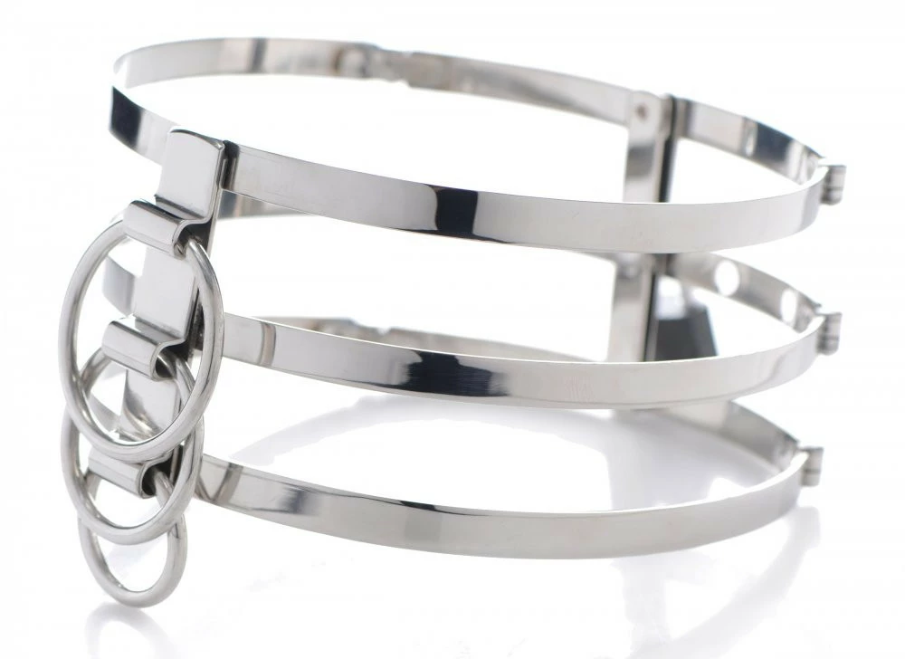 Cage your lover’s neck in this weighty, stainless steel locking collar! This trinity of rings wraps around your lover’s neck without applying direct pressure, great for those who are uncomfortable with having their breathing blocked or restrained. This cage rests on the base of the neck, providing a satisfying weight to your lover’s collarbone area!