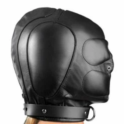 This padded leather hood takes control a step further by more effectively depriving the wearer of his senses. It can be locked on, and a D-ring on the front allows you to hook up a leash. With only his sense of touch available, the wearer is at his partner’s mercy. Of course, with some senses blocked out, those remaining senses are so much more alert.