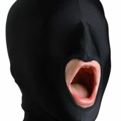 Keep him in the dark for extra stimulation with this premium double layer stretchable spandex hood with a mouth opening. The mask was created using two layers of highly stretchable spandex to ensure comfort yet remain firmly on the head. It is made of 83% Nylon and 17% Spandex. That equals 100% bondage fun for you.