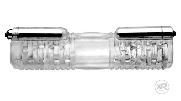 Mutual masturbation has never been so interactive! Both you and your partner can lube up and slide your shafts into the tight, textured interior of this cock sleeve. Powerful dual bullets stimulate your rods as you thrust in and out, rubbing your cock heads together in the middle of this completely hollow stroker. The no-slip texture on the outside lets you get a firm grip, while the see-through material lets you get a good look at all the action. Get ready to cum all over each other’s cocks in this powerful vibrating sleeve!
