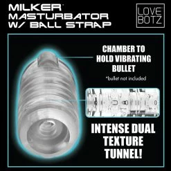 Squirt out your favorite water-based lube into the stroker and squeeze your shaft into the tunnel! Pull the ball strap around your balls so it can stay securely in place. As you pump your way to increasingly intense levels of pleasure, enjoy the feeling of the strap tugging gently at your balls. Combine your jackoff experience with extra stimulation and turn on your favorite erotic film, daydream about your crush, or simply check out how hot your dong looks in the semi-translucent sleeve! Pair it with the Milker Pro and go hands-free for an experience like you’ve never had before!