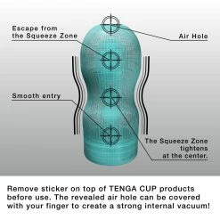 Change suction intensity via the air control hole found at the tip of these cups! Give this stroker cup a good squeeze to force out some air and plug the hole with a finger and enjoy the new intense suction in tandem with the unique and varied texture found from base to tip of this cup.