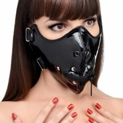 Sliding easily over the face, this muzzle is designed to cover your partner’s mouth limiting how much they can speak. The muzzle has a vinyl exterior and nose holes, for breathing. The mouth is covered by a zipper closure. Elastic bands secure the muzzle around the head.