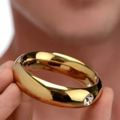Show off your manhood with a bold and beautiful cock ring that makes you harder and more sensitive than ever before! This golden cock ring is accented with a sparkling gem set deep into the front that will draw their eye right where you want it. Submerge in hot or cold water to change the temperature of this ring for added stimulation. This luxurious cock ring makes a statement as it buffs up your cock and keeps you ready for action all night.