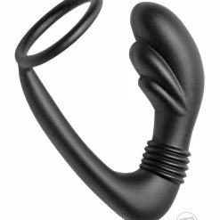 Upon sliding on the cock ring, men are rewarded with a longer-lasting and harder erection. With this unique device, they are also treated to stimulating prostate massage. The angled head slides easily into the anus and, working with the man’s movements, will stimulate the prostate. The silicone shaft is ribbed and ergonomically curved for comfort. The smooth matte material is non-porous, phthalate-free, and cleans easily and will not trap germs.