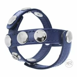 This blue leather cock ring has 3 silver colored metal snaps on each side, which allows adjustment to fit a wide variety of sizes. Two extra straps, also secured by snaps, harness and separate the balls (one strap goes around the balls and the other between them). This attractive cock ring ball harness can also help you achieve a harder, thicker, longer lasting erection.