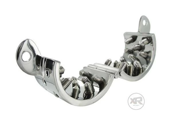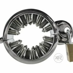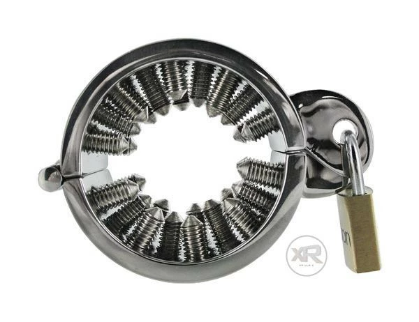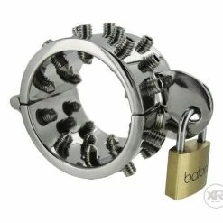 The Tom’s Spikes is a heavy-duty stainless steel CBT device that is perforated with 28 holes through which adjustable screw points can be threaded. The lightly pointed ends of the screws press in on their package to really drive your point home. The points are fully adjustable with the included hex key: start with them withdrawn all the way, then put the Spikes to work as you begin to tighten them up to inflict as little or as much discipline as you desire. The spikes can be removed entirely and the device can be used as a smooth steel cock ring or ball stretcher.