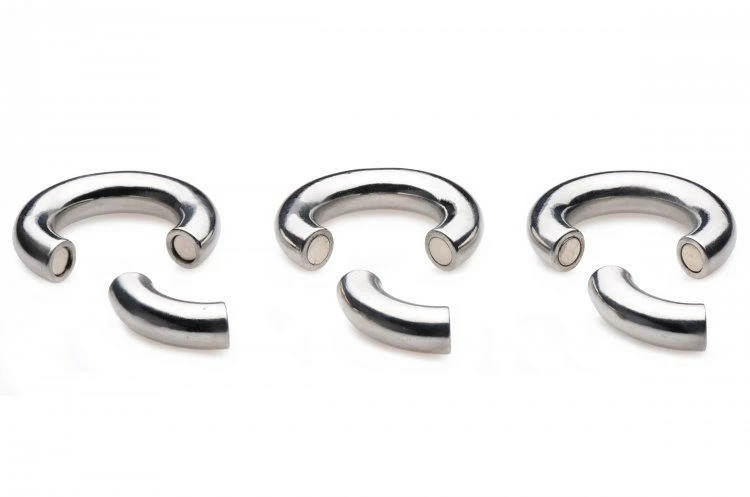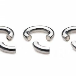 Use three heavy rings to weigh down your scrotum! Each of these stainless steel ball stretchers opens and closes magnetically, with a portion that pulls off so that you can slide your scrotum in. Pace yourself by starting with one ring and working your way up to all three! Each ring weighs a whopping 7.5 ounces… are your nuts ready to take on a total of 22.5 ounces of metal? Savor the unique pulling sensation while you jack off, get punished by your lover, or even do chores around the house! These durable accessories will amplify your sexual experience and heighten your climax! Clean after use with soap and warm water. Compatible with all lubricant types.