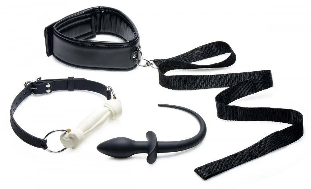 This kit has everything you need for puppy play – a firm, adjustable bone gag, flexible tail anal plug, adjustable collar, and even a leash to go on walks! Use all items at once for the full experience or play with a few items at a time for a more subtle approach to puppy play.