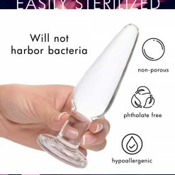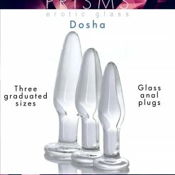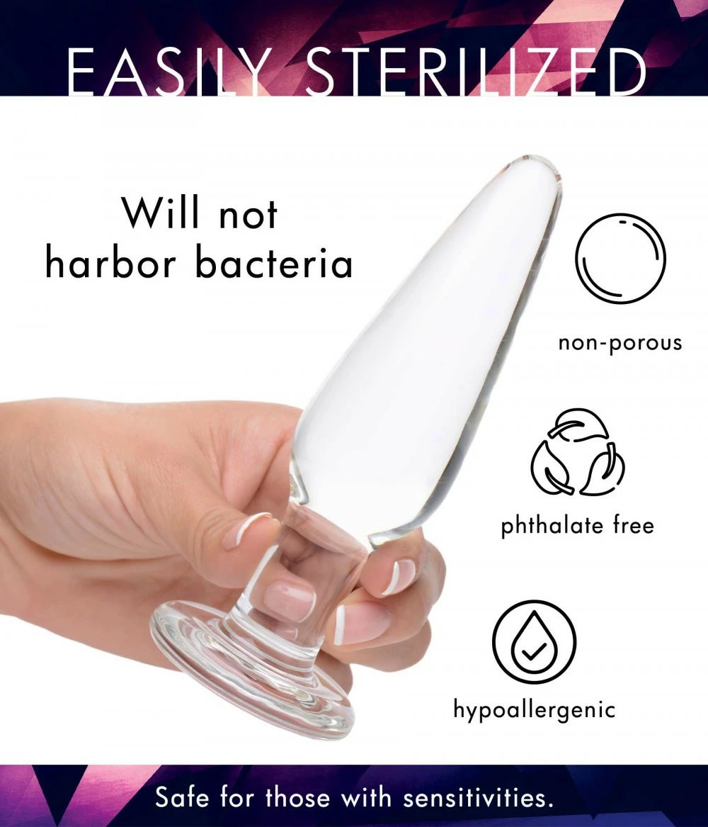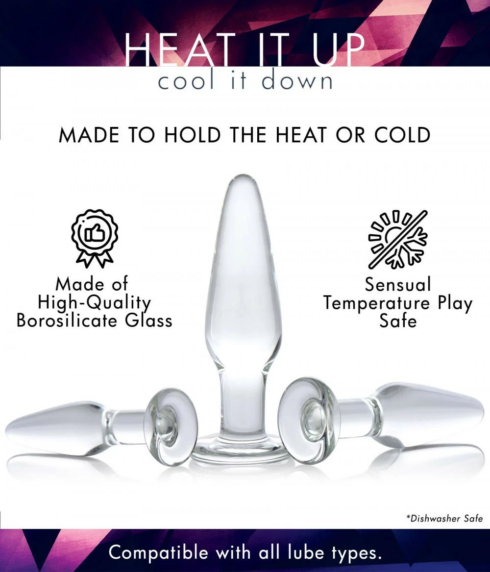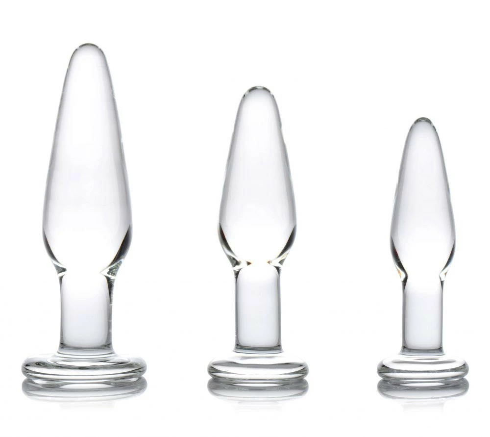 Stuff your asshole with each of these glass butt plugs in turn! The slick glass will slide smoothly past your sphincter for easy penetration, but the weight will create a greater sense of fullness. You can also change the temperature of these plugs by submerging them in hot or cold water. Your anal cavity will be filled to the brim with intense sensations that will keep you turned on as long as the Dosha is in you. Each plug features a tapered tip for easy insertion, and a flared base that will help keep it in place. Phthalate-free and easily sterilized, it is compatible with all lubes and will not harbor bacteria.