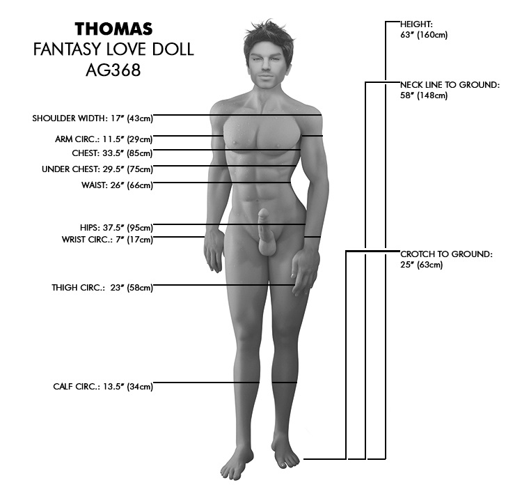 Thomas’s sexy body can be soaked in warm water prior to playing with him to create a more realistic body temperature. Get his orifices dripping wet with only water-based lubricants, and clean before and after use with a toy cleaner or mild soap and warm water. Wipe down, dry, and powder his surfaces before storing him between uses. Do not store anything on top of him to retain his shape.