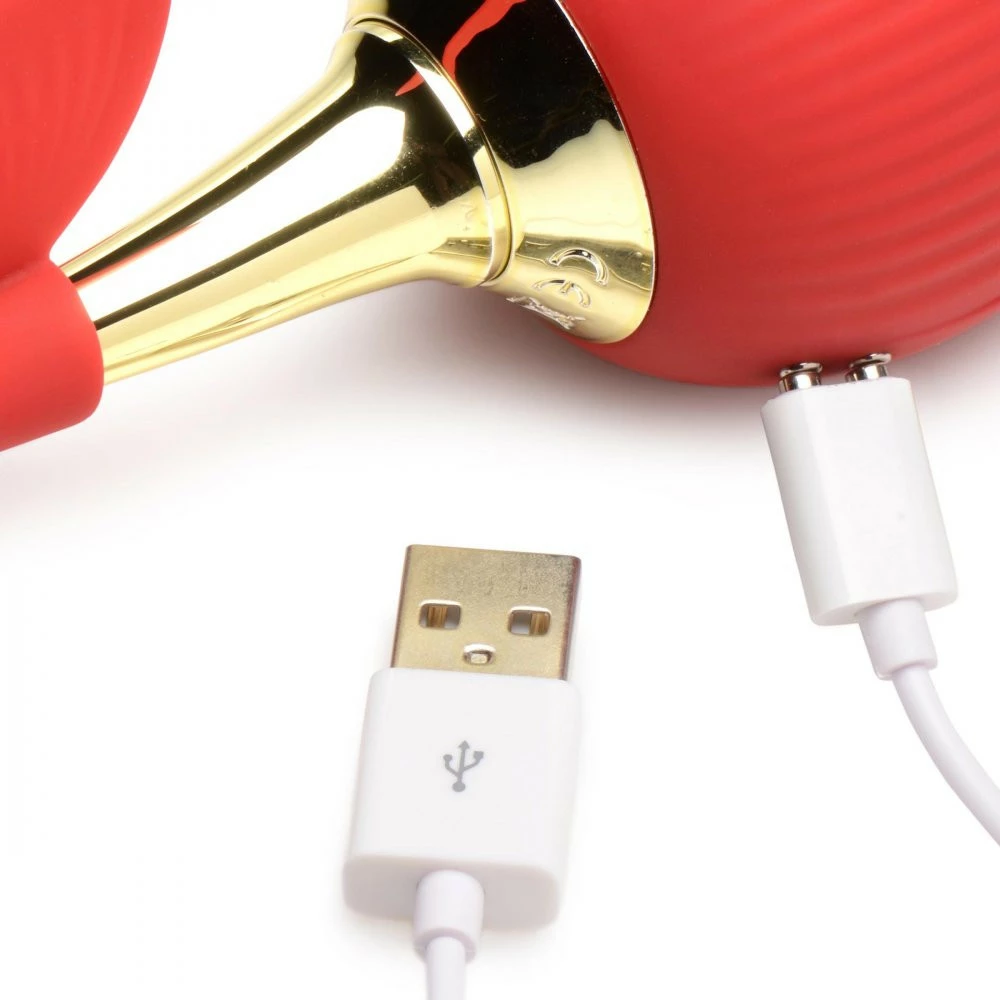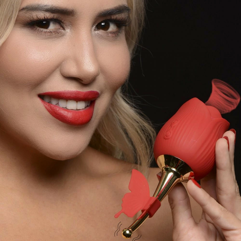With this golden-stemmed, blooming rose and fluttering butterfly you’ll be blossoming in wet, slick pleasure in no time! The round hole of the open bloom rose has 10 delicious clit-sucking modes to choose from. With a golden stem that lets you position it just right, you can angle the flower to kiss your precious pearl and make it grow. Turn on any of the 10 vibration modes as well and feel the vibrating, golden stem deliver pinpoint pleasure from the round bead at the tip; get exactly what you want in the precise location you desire. Add the silicone butterfly to the stem and its quivering flutter can tease and stimulate your clit and lips. Use this on your clit or nipples for even more playful options! Take it in the shower for extra wet fun! This rose is waterproof with a rating of IPX6. Made of premium silicone, this toy is plush, silky smooth, phthalate-free and body-safe. Use only with water-based lubricants. Recharge using the USB cable provided.