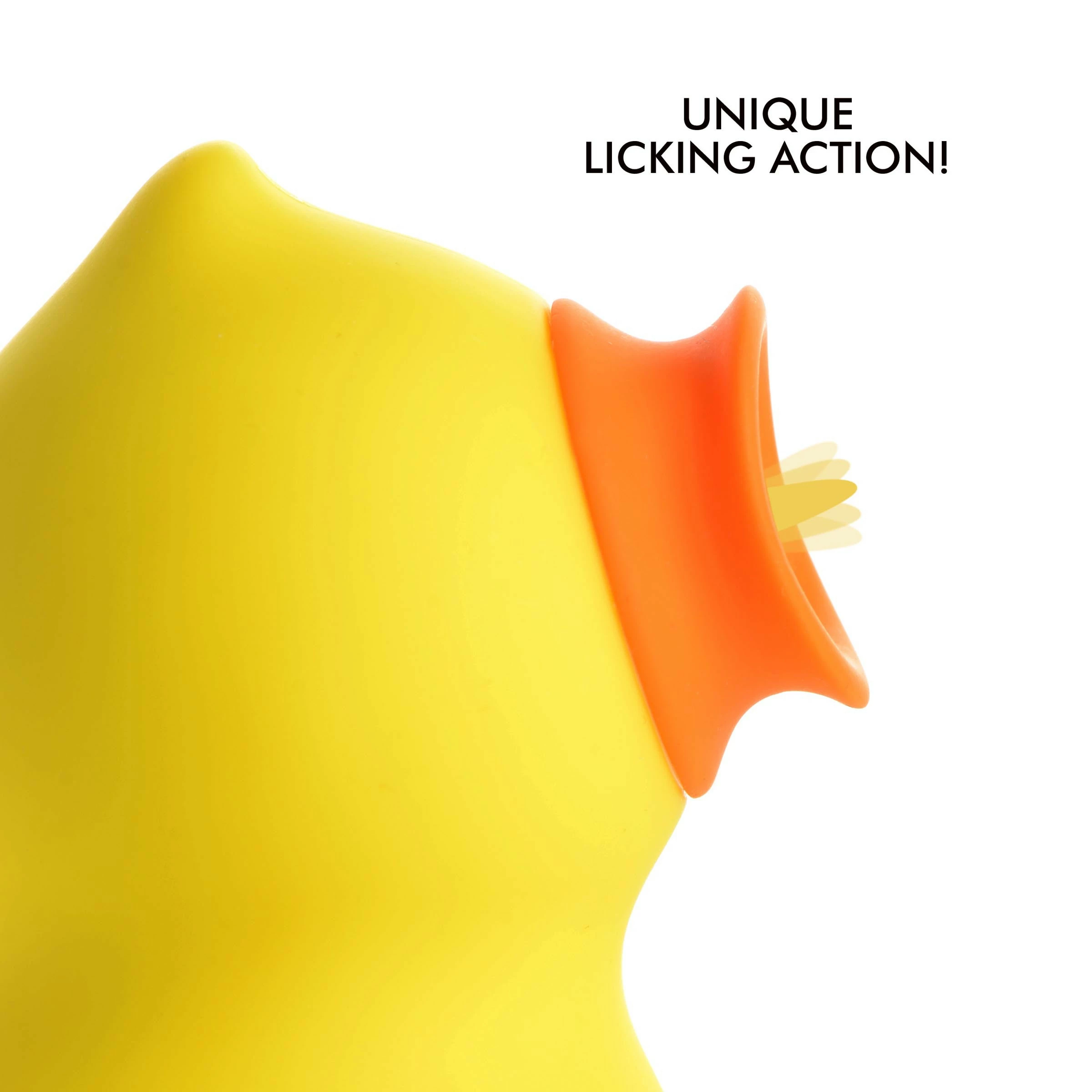 This duck shaped toy is perfect for discreet, sexy fun! The face of the duck has a suction hole that seals around your clit and a little ducky tongue that licks you until you’re in a frenzy of pleasure! With 7 suction modes to gently suck and give your bean a blowjob, plus an additional 3 speeds and 4 patterns of licking, this will end up being your new bath-time bestie! Made of premium silicone, this ducky is phthalate-free for body-safe and worry-free play! Use only with water-based lubricants for best results. Enjoy playing with this waterproof ducky in the shower, jacuzzi or bathtub! The ergonomic design helps you hold it without straining your hand or wrist to get that perfect spot. Make your ducky satisfy your clit by burying them face-down in your muff! To charge, place the duck on the charging pad and plug it in using the USB cable provided. Wash the ducky after use with warm water and mild soap, then spray with a toy cleaner and wipe dry.