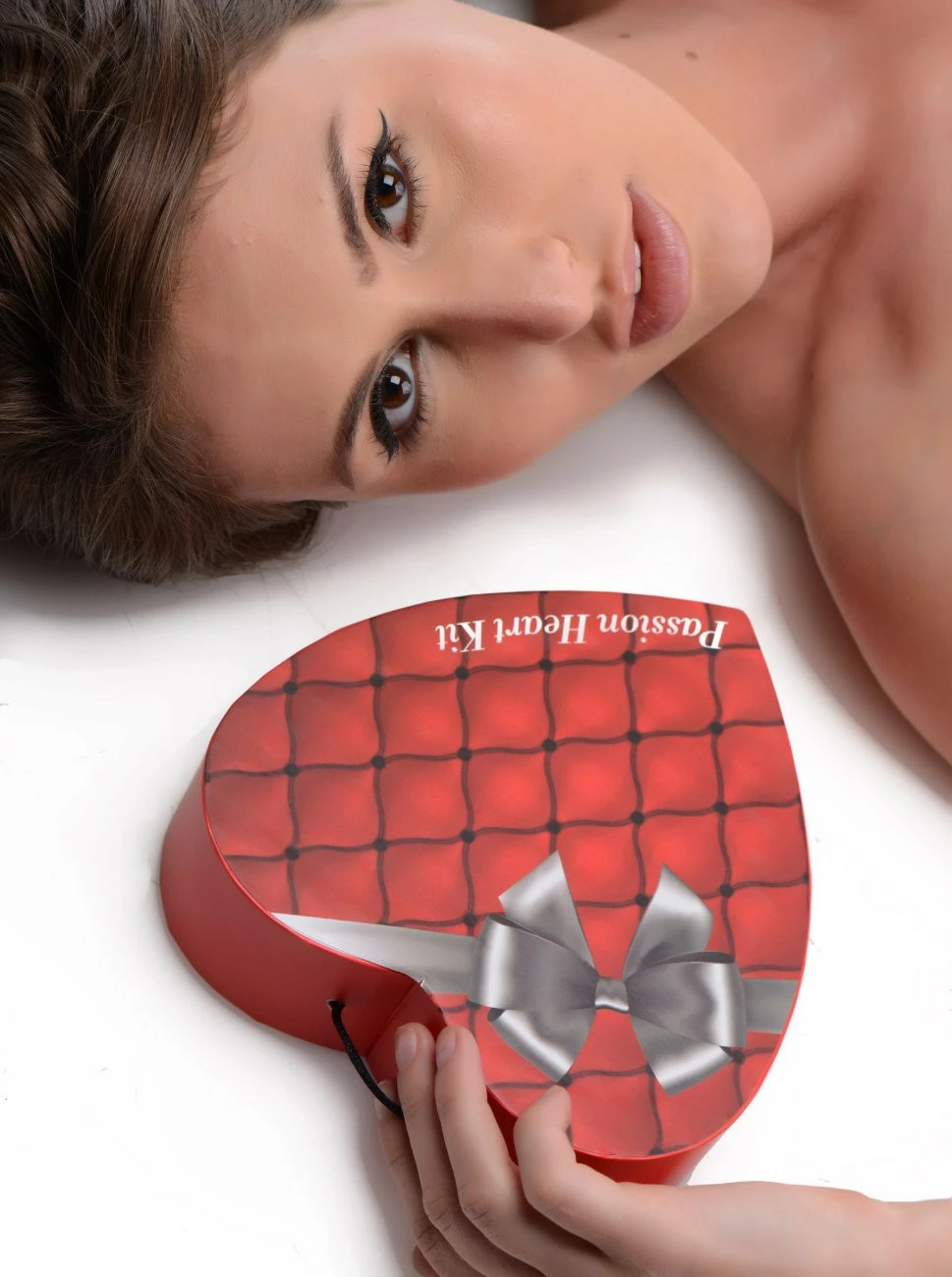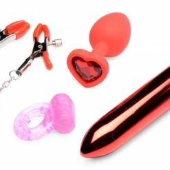 Perfect for gifting! This Passion Heart Kit features everything you and your lover need to elevate the heat of your bedroom: Nipple clamps with heart shaped dangling weights, an intense multi-speed vibrator, a stretchy vibrating cock ring, and silicone butt plug. Treat yourself to a set of essentials perfect for every skill level!