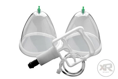 This easy-to-use pumping set allows you to experience increased sensitivity and engorgement on your own or with a partner! Place each large cup against your breast area, creating a tight seal with the rubber ring. Attach the white end of the tubing to your handpump, and the green end to the tip of the cup. Pulling the trigger on the pump will create pressure that will suction your tit into the cup. Once you’ve reached your maximum comfort level, the tubing may be removed and your flesh will remain vacuumed within the cup. When you’re ready release the pressure, push the green tip and remove the cup. At this point, your breast will still be temporarily swollen and sensitive, providing new stimulation opportunities as you play with your boobies.