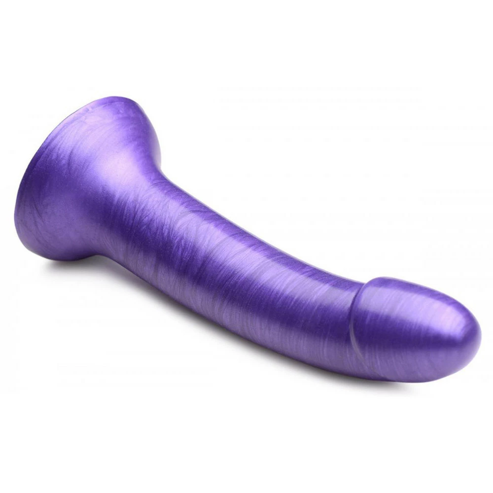 Add this metallic dildo to your collection and bring a little sexy color into your play! This silicone dildo has a beautiful metallic sheen and comes in blue, pink or purple so you can match it with your toys or let it stand out as unique! The smooth, silky texture is due to the premium quality silicone it is made with. Guaranteed to be phthalate-free, it is body safe to use during play; make sure to only use water-based lubricants to ensure a long shelf-life. The suction-cup base can be pressed against any flat surface for a hands free ride, or you can use the wide, flanged base to pair it with a compatible harness as long as the hole or ring is smaller than the base. Have fun pegging your partner or playing with yourself with this sexy dong!