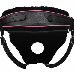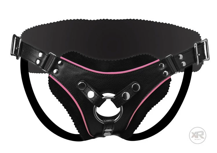 This leather strap-on harness offers a compelling blend of both style and function. There are pink accents for a fashionable look, but you can still attach that favorite (flared-based) dildo and penetrate your partner how you wish. The belt is fully adjustable, with buckles at the hips and rear straps for a tight fit. The back is wide for more support, and lined with soft fabric for comfort. The front has an easy snap-in feature. With one of the two included steel O-rings, you can add your favorite dildo, with multiple size options.