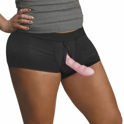 Ditch the bulky harness and wear an incognito, breathable and comfortable pair of harness boxers that give you the option to pop in a strapon dildo any time you want without fussing over an outfit change! Wear this cotton/spandex blend harness under your pants, skirt or dress. The smooth material hides a built-in O-ring at the front that fits most strapon dildo bases. The wide, supportive elastic band helps support the weight of your strapon dildo and keeps the boxers from sagging. As an added bonus, care for your new harness is easy! Simply machine wash your boxers after each use on a cold cycle. To preserve the life and elasticity of the fabric, hand-wash and air-dry to avoid exposure to heat.