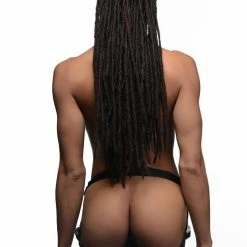 The simple but attractive design of the harness wraps seductively around your waist and each thigh, hugging your ass. Adjust it at 4 points for the perfect fit. The snap closures around the O-ring allow you to easily insert this dildo or another from your collection, even swapping out the O-ring if necessary for a larger girth.