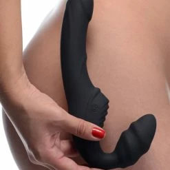 Perfect for pegging or female-female sex, this dual-ended dong is sized for those who prefer a smaller insertion. Made of premium silicone, this sophisticated design allows you to engage in simultaneous penetration during strapon sex. Insert the softly ribbed bulb for G-spot stimulation while you grind your clit against the raised ridges of the exterior. As you thrust the slender, smooth shaft into your partner, its defined head and subtle ridges provide an internal message to all the right spots. But the best is yet to come… Play with 3 intensity levels and 6 pulsation patterns that reverberate through each end of this double-sided dildo. An easy-to-use button allows you to cycle through them even during all the action! Feel like getting even more wet? Take your fun into the bath or shower with this waterproof pleasure tool. This material is not compatible with silicone lubricants, but is non-porous, phthalate-free, and cleans easily with mild soap and warm water.