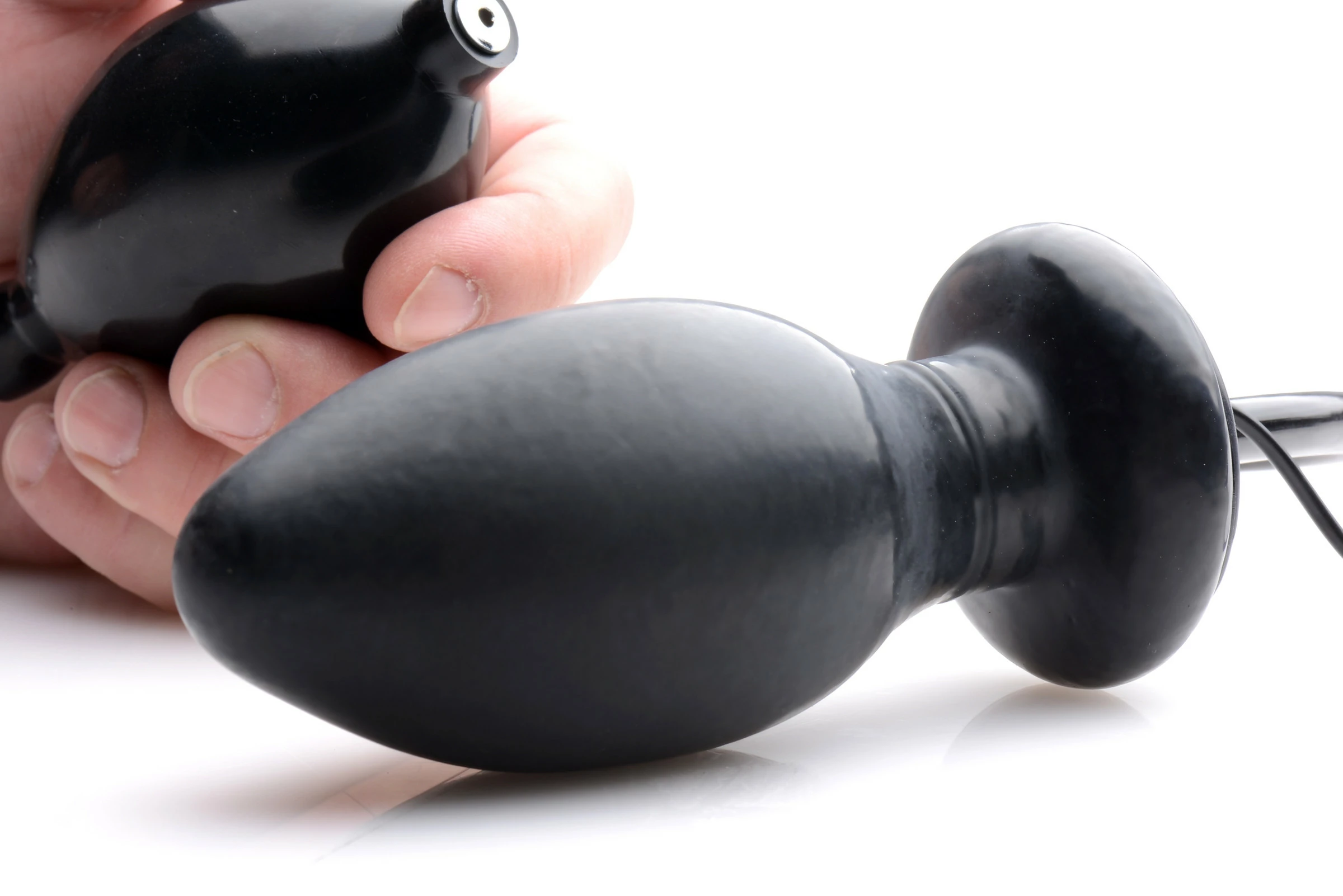 She’s on her hands and knees with that tight asshole just begging me to do amazing things to it. I knew she wouldn’t be able to handle the insertion of one of our huge dildos yet, so I got creative and found a way to get her insides prepared for the invasion. The Inflatable and Vibrating Butt Plug is small enough when deflated that, with some lube, I easily shove it up her ass while she moans in pleasure. I turn on the vibration and she begins to move her hips back towards me. Then comes the fun part, and she doesn’t even know it. Her moans suddenly turn to high pitched squeals as I begin to squeeze the bulb pump. I know that her ass is stretching to accommodate the increasing size of the plug. Turning the vibration up higher, I continue to pump. She falls silent with complete pleasure, just feeling the swollen plug vibrating inside her. Finally she whispers, “Please fuck my ass, Sir.”