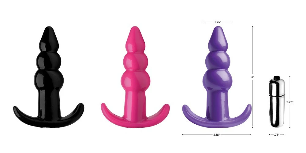 Follow up the tapered first bulb of this rippled rump rocker with two more smooth bulges. Press the button on one-speed vibrating bullet to send thrumming thrills into your hole. The vibe can also be removed to stimulate other parts of the body on yourself or your partner. The narrow base is shaped ergonomically to sit snugly between your asscheeks. This textured teaser is perfect for booty beginners or anal enthusiasts!