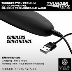 You’ll never settle for another vibrating massage wand once you feel this long-awaited upgrade of the classic and trusted Thunderstick! Now coated entirely in seamless, sleek-as-silk silicone, the Premium edition of this powerful vibrator has a contoured handle that allows you to maintain a comfortable and secure hold while also reducing reverberation into your hand and arm. Best of all, this beautiful massager is also rechargeable, for cord-free pleasure and convenience. Instead of the variable speed dial, this exciting new version gives you 4 levels of thrumming and 7 patterns of throbbing to use on any part of your body. The Thunderstick Premium is waterproof, making it great for use in the shower. Because it’s made of high-grade silicone, it is non-porous and phthalate-free. Sanitize after use with toy cleaner or mild soap and warm water. Preserve this material by never using with silicone lubricants.