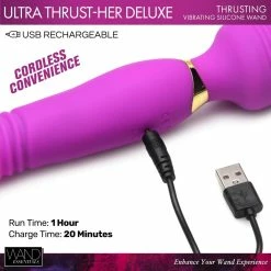 Combine the powerful vibrations of a vibrating wand with an auto-thrusting shaft! With this Thrust-Her Deluxe Thrusting and Vibrating Wand you can enjoy both external and internal stimulation for full bodied orgasms! Have all you want in one vibe and enjoy 3 speeds and 7 patterns of rumbling, buzzing sensation both in the shaft and through the round head of the wand! The shaft itself has 3 thrusting modes so you can insert it and let it do the work for you! Then switch it around and use the shaft or the wand head to massage your clit and vulva! Use solo or with a partner for a little extra fun in the bedroom! Designed to be waterproof, you can also take it in the shower or bathtub and submerge it for up to 30 minutes! Use only the best quality materials; this toy is premium silicone and is phthalate-free and safe to use in and on your body! Only use water-based lubricants. To clean, wash with warm water and mild soap, then spray with a toy cleaner and let dry. Recharge between sessions with the USB cable provided.
