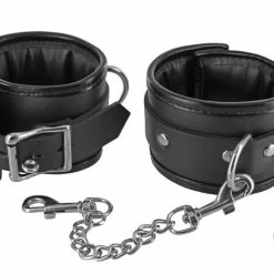 Lock your submissive up in style with these comfortable, padded cuffs for your all your bondage needs. Double layered and padded internally, they are lightweight yet secure, with a removable chain tethering them together. Each cuff comes with its own padlock and keys, so that they’re at your will until you’re ready to let them out. The vegan material provides a classic look to make your fantasies come to life. Bind your partner’s arms in front of them, behind them, to the bed, or over their head… the possibilities are endless!