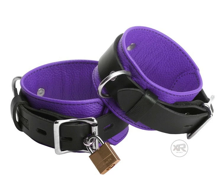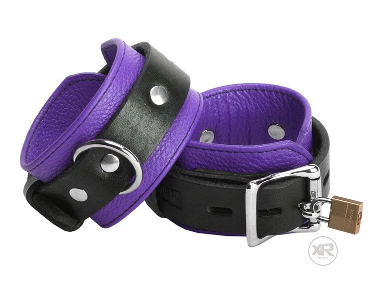 Enjoy a visual and functional bondage experience with the Strict Leather Deluxe Black and Purple Locking Cuffs.