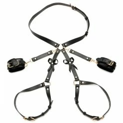 Show up as a gift wrapped, bondage babe with this Bondage Harness with Bows! Your submission is a gift, so present yourself like one! With this vegan-friendly, faux leather harness you can feel sexy and submissive. The straps wrap around the waist and thighs and are completely adjustable. Use the body-safe, nickel-free metal buckles to cinch the straps tight against your thighs and waist for a perfect fit. Attach the cuffs to the sides of the harness and use them as restraints or wear them and await your Dominant’s directions. To clean the PU leather after play, spray with a toy cleaner or isopropyl alcohol and then wipe clean.
