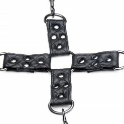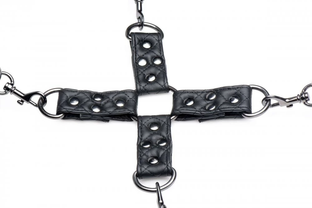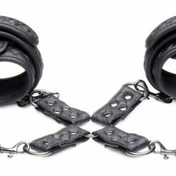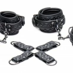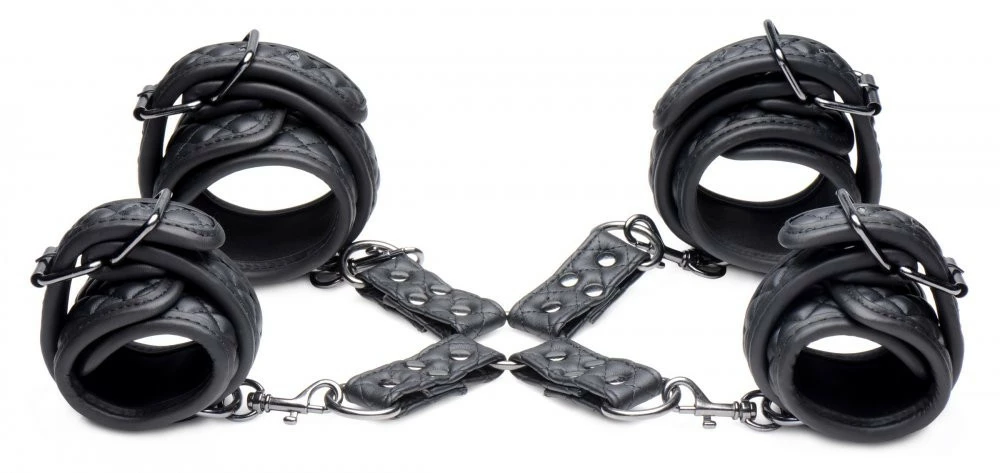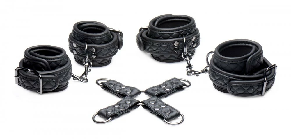 This 5 piece kit includes a set of elegantly quilted wrist cuffs, a matching set of ankle cuffs, and a versatile hogtie connector. Use the cuffs on their own or with the center hub to bind your plaything in the most vulnerable positions, exposing them to your devious desires. These cuffs are sturdy and durable, to effectively keep your partner at your mercy though years of pleasing, teasing, and tormenting. The hogtie has 4 D-rings that easily and quickly connect to the swivel clasps of the cuffs. Easily adjustable, these restraints tighten or loosen for a comfortable and secure fit.