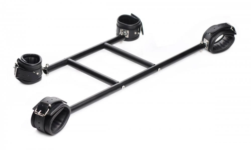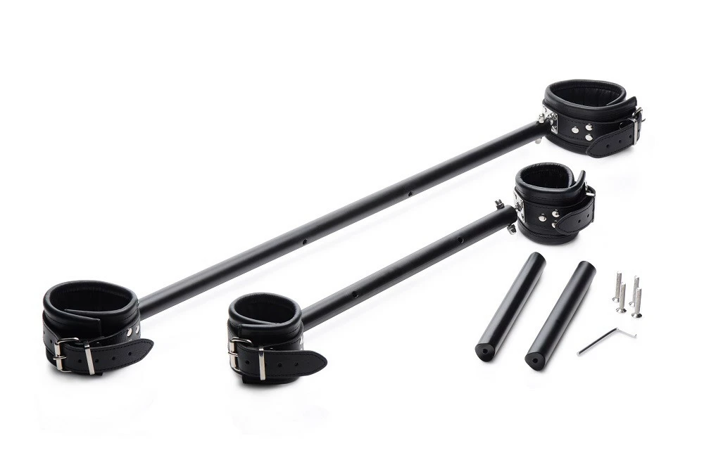Keep your slave or sub spread wide open for your perusal and amusement! This double spreader bar can be used together or as two separate pieces to pry apart their legs and arms, leaving their body helplessly exposed for your most devious desires. The connector bars attach easily so that you’re always ready to put your partner in a compromising position. At the ends of either bar is a pair of gorgeous cuffs, made of quality leather. The soft interiors will remain comfortable on their tender wrists and ankles even during extended play sessions, but the heavy-duty hardware ensures that there’s no hope for escape!