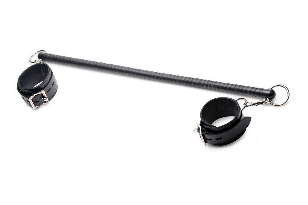 Use the bar to maneuver your partner’s body into various positions, and as leverage for hitting the right spot during penetration. Locks can be added to the buckles of the cuffs to increase your plaything’s helplessness.