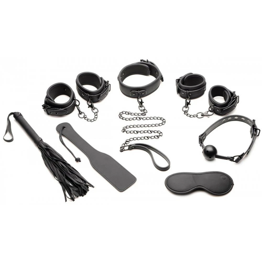 - 10 Piece Deluxe Set: Everything you need for basic bondage. Set includes wrist cuffs, ankle cuffs, collar with leash, breathable ball gag, plus a few kinky items including a flogger, paddle and blindfold.