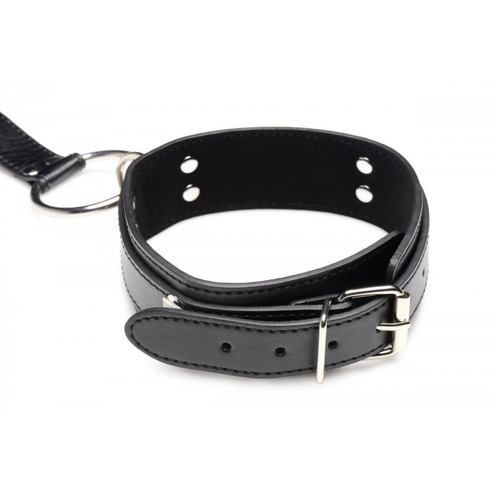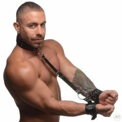 Get your partner kneeling or sitting in front of you and have them lift up their chin, exposing their bare neck. Bring the collar around their neck and begin to tighten it so that it’s snug but not too tight. Pull the large, center strap down either in front of their body or in back, then take one wrist at a time and begin to strap in their wrists. Once strapped in, enjoy them being restrained. Pull their hair, tease them, have them serve you and enjoy putting them in fun predicaments where they have to struggle to use their hands but struggle to do so. Play with their erogenous zones and then use the O-rings to strap them into other restraints if you so please. See how sexy it is to watch them restrained and in service to you!