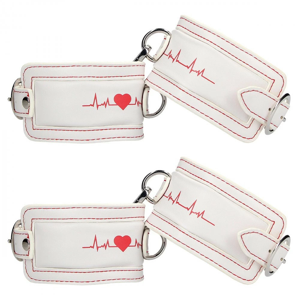 For those who want a bondage set that really stands apart from others, this medical play themed set is for you! With a bright red ‘Life-line meter’ and a heart contrasting the pure white background of the PU leather straps, this gorgeous and unique bondage style really grabs the heart of those who enjoy playing naughty nurse and dirty doctor! Whether you’re in control or playing the pervy patient who gets examined, this set includes all you’ll need for hours of kinky roleplay! Included in the kit are wrist and ankle cuffs, collar and leash, blindfold, and hogtie straps with lobster clasps that clip onto the cuffs! Added into the bundle are pleasure and pain items; enjoy the flogger whip and the buzzing, vibrating, nurse-themed panties that hold a plastic bullet that is remote control operated for your partner to tease you with! All restraints are made from PU leather (vegan friendly faux leather), metal and padded with foam. The mouth-gag has a silicone heart. Panties are made from polyester and PVC; hand wash only. Clean all items after use by wiping down with a damp cloth and spraying with toy cleaner.