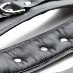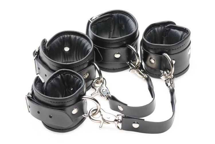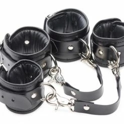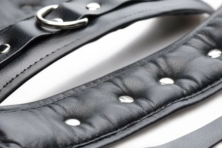 Exert your complete authority over your slave or sub with these elegant, comfortable, and safe bondage cuffs. Available for your wrists and your ankles, they can be adjusted to the perfect fit with the sturdy buckles. The D-rings on the cuffs are connected by a strap with two clasps, but can be detached and configured to ropes, chains, a hogtie, a collar, or whatever your wicked mind devises. The interior is made of genuine leather and padded so that your plaything can withstand hours of pleasing, teasing, and tormenting.