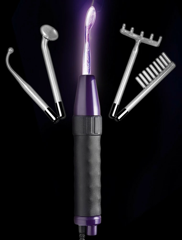 This violet wand throws thousands of tiny lightning bolts from the glowing glass attachment to the recipients skin. Each can feel like a gentle tingle or a tiny pin prick depending on how high you turn up the wand and which attachment you use.