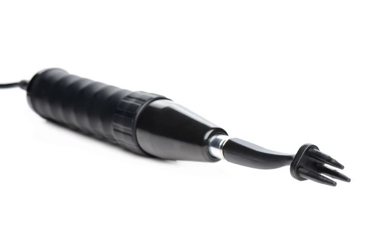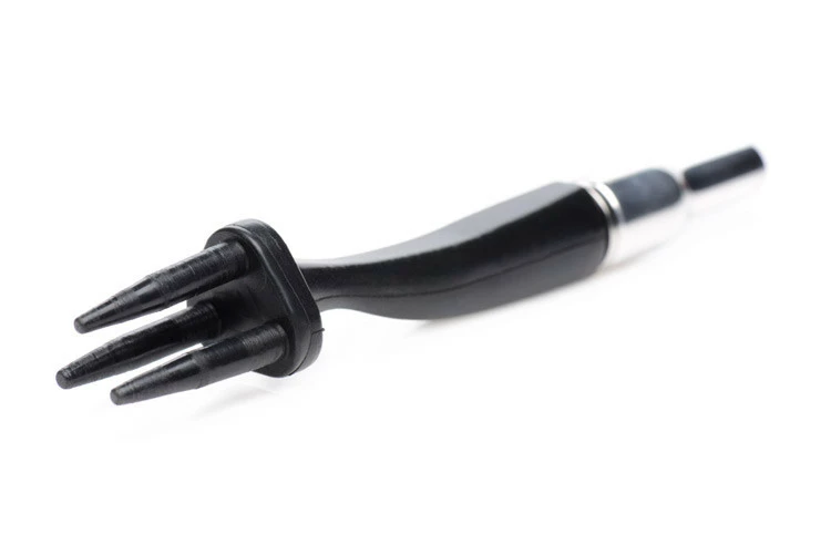 Zeus must have borrowed Poseidon’s famous trident to bring you this triple-pronged accessory for your Violet Wand! Target a vulnerable and irresistable area of your partner’s flesh for erotic electro-stimuation. Fragile glass accessories break easily and are difficult to travel with. This silicone fork can easily be thrown in your toy bag and brought over to a friend’s house for playtime. The non-porous and phthalate-free silicone conducts the electric current perfectly, each point becoming charged with electricity for three sizzling jolts with even the gentlest touch.